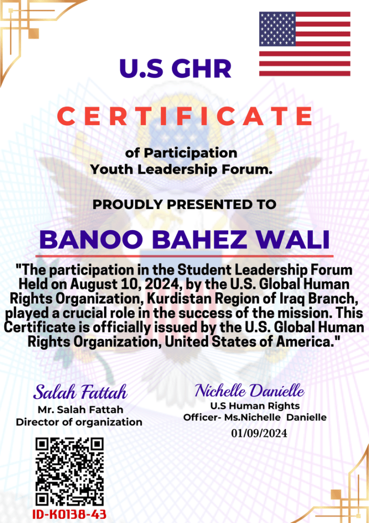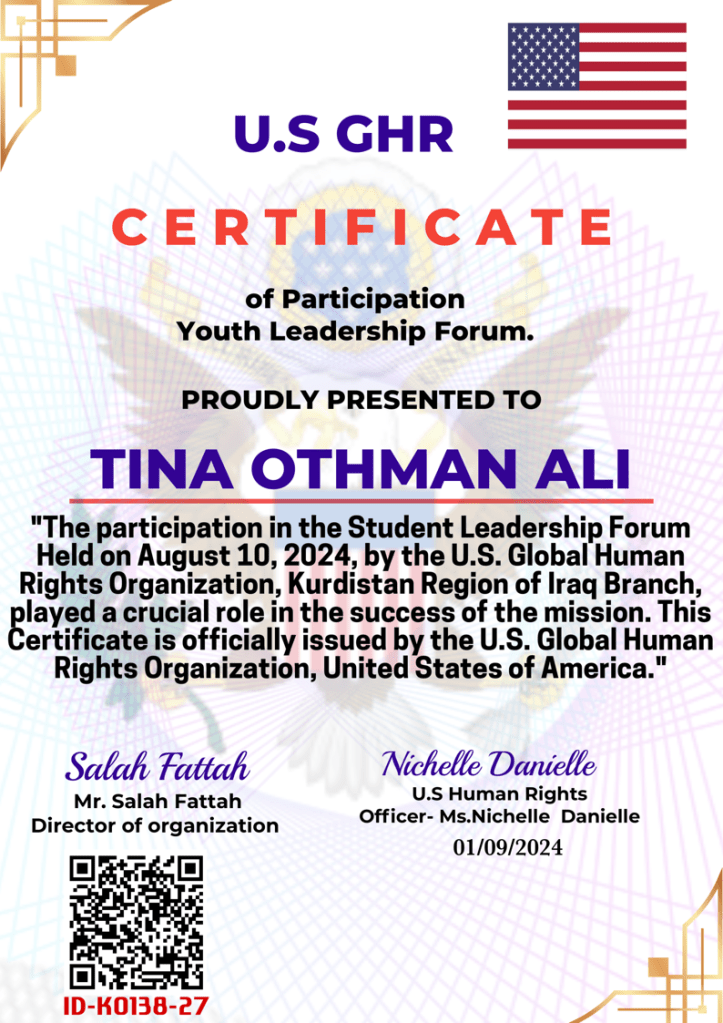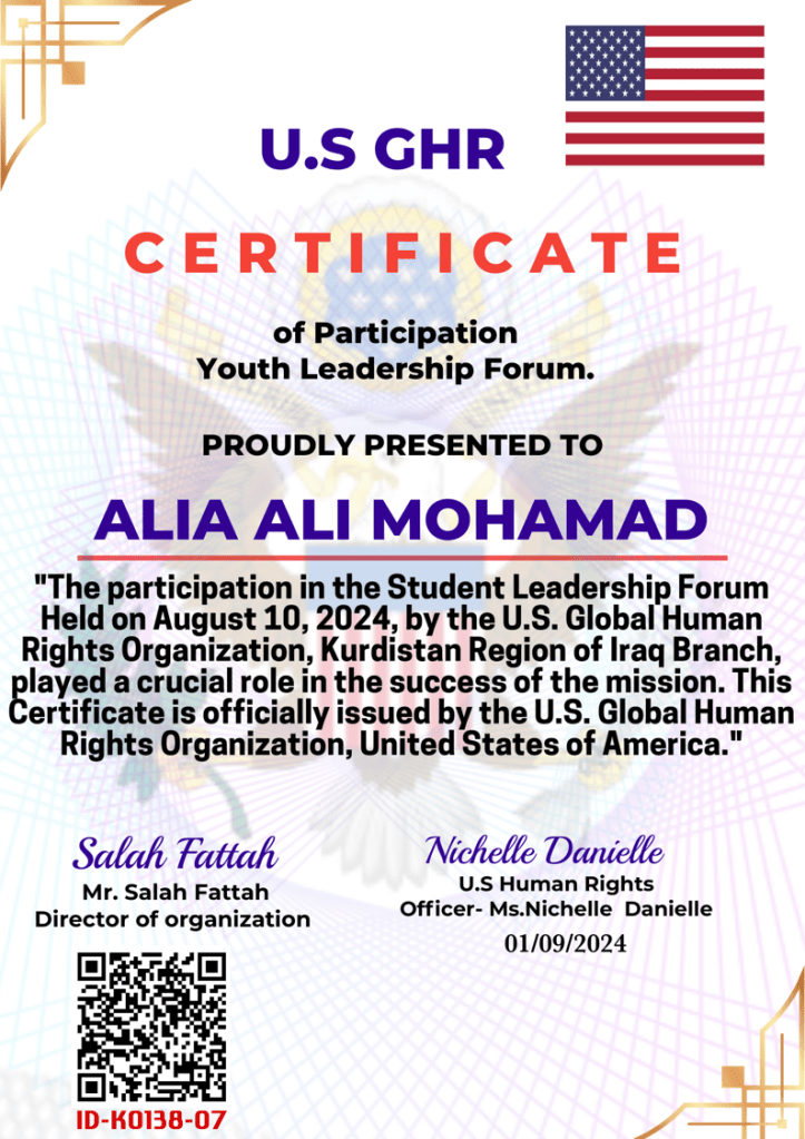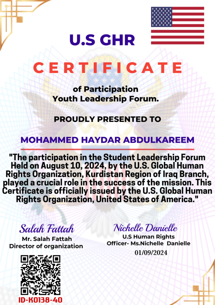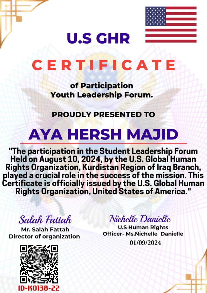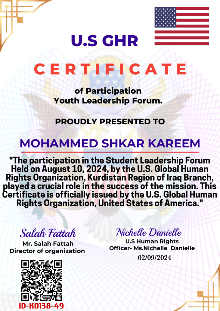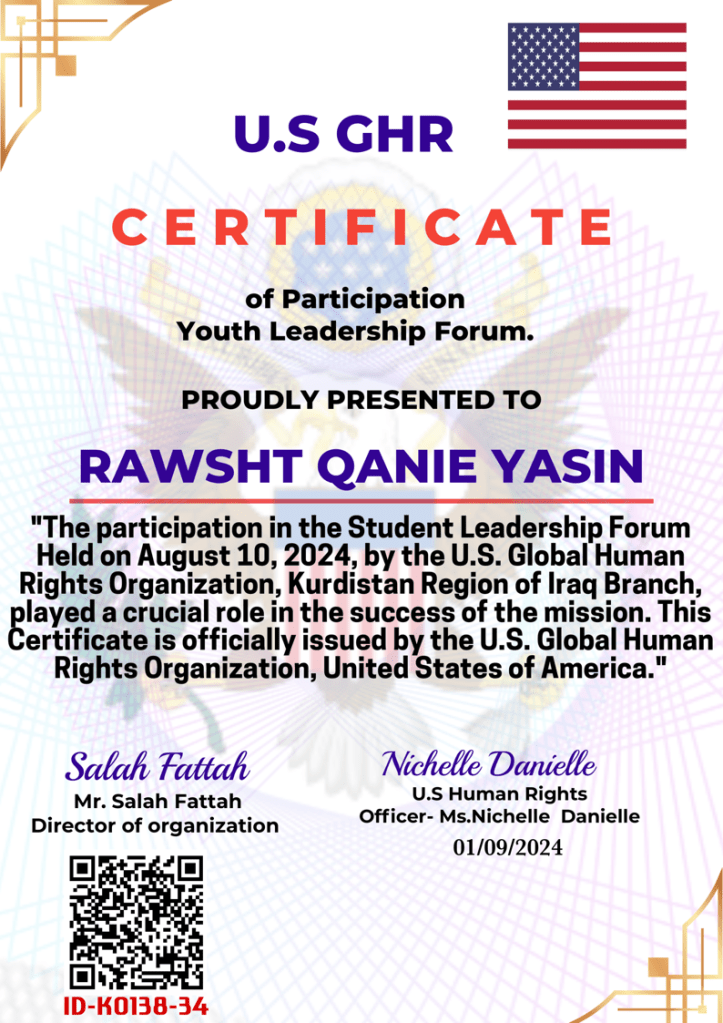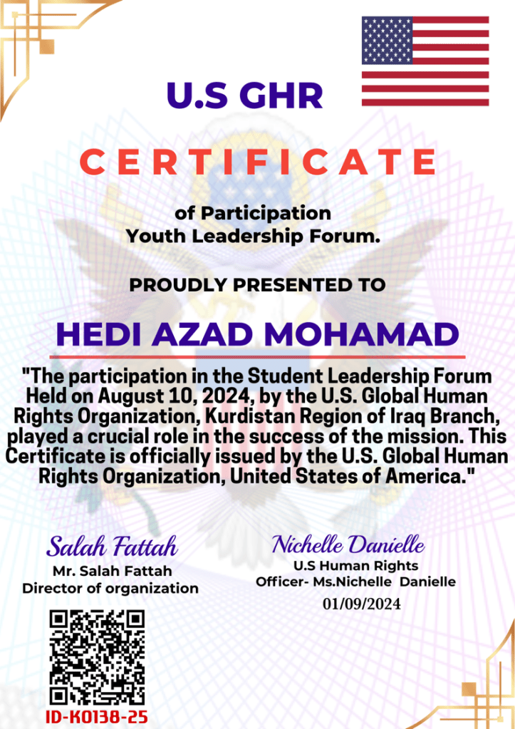 Special recognition goes to Dr. Said Salah Aziz , the head of the World Human Rights Organization, Kurdistan Region branch, for organizing these seminars and workshops. His leadership and support have greatly contributed to the progress of our institute.