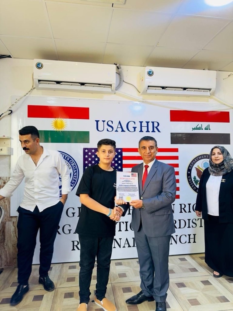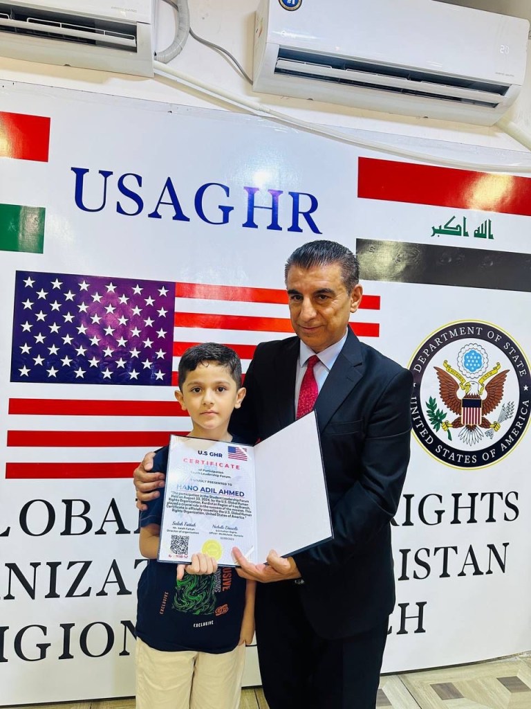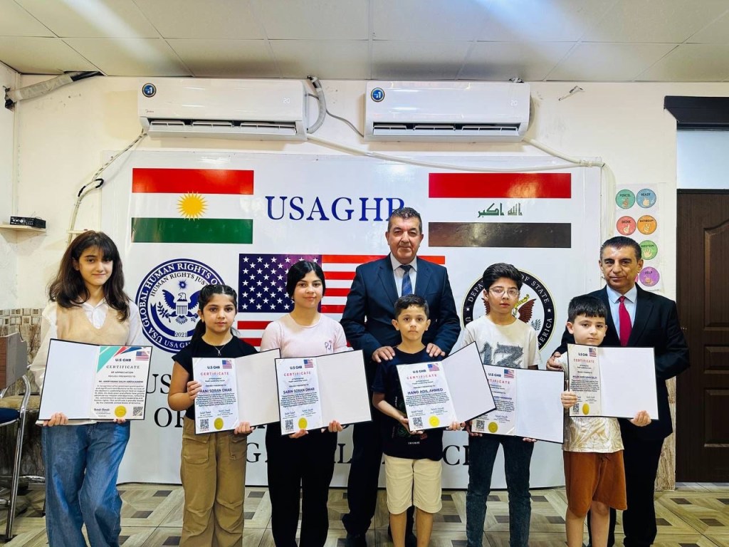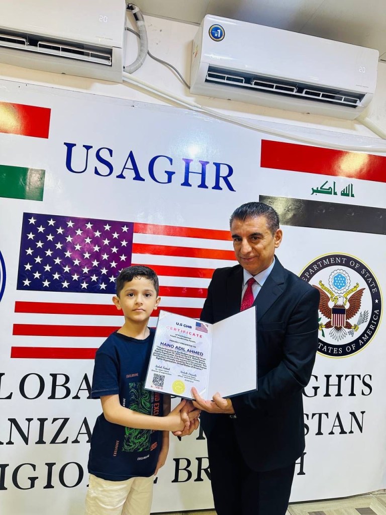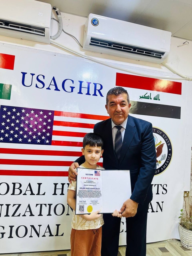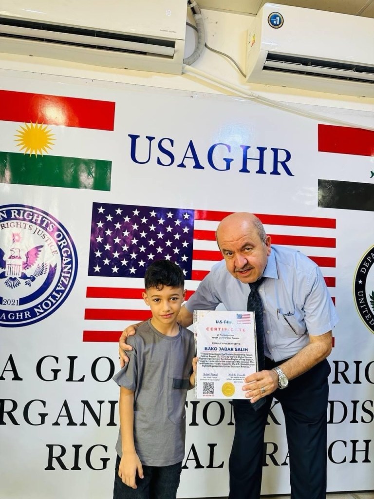 ڕێکخراوی جیھانی مافی مرۆڤ لە ولایەتە یەکگرتووەکانی ئەمریکا لقی ھەرێمی کوردستان لە چالاکیەکی نمونەییدا ئەمڕۆ2/9/2024 لە شاری دەربەندیخان بڕوانامەی سەرکردەی پێشکەش ئەو منداڵانە کرد کە بەشداری خولی سەرکردەیان کردبوو کە لە لایەن ڕاھێنەری نێودەوڵەتی دکتۆر ابراھیم جاف وترایەوە.